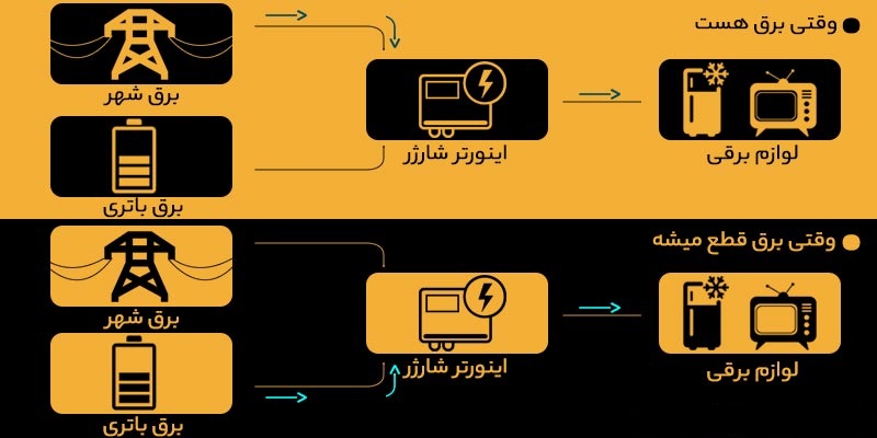 در صورتی که به برق شهری دسترسی داشته باشند. می توانند باتری را با اینورتر با شارژر باتری موجود شارژ کنند. هنگامی که برق قطع می شود، اینورتر نیروی باتری را به جریان متناوب (AC) تبدیل می کند.
